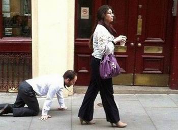 在伦敦,同样的一幕闪现,一名女子手持狗带,牵着一名穿上恤衫西裤的男子,男子还在街上爬行。