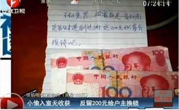 盗亦有道,徐州一小偷就在入室盗窃,因看到屋主家庭贫困,便收手留下了200元和一张字条:“不好意思,你家真是一贫如洗,是我从未遇到过的,这200元你拿去换锁吧…”