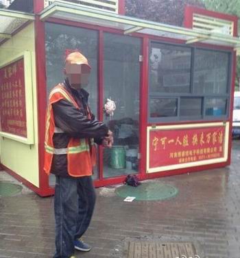 郑州下雨,一环卫工无奈地站在屋檐下避雨,衣服被雨水湿透,而旁边休息室的们紧闭,只是长叹一声说:“经理拿着钥匙啊,谁也进不去。”