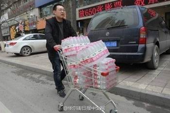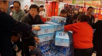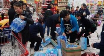 就在曝出兰州自来水苯污染后,当地出现抢水潮,一箱矿泉水价格涨到了百元,警察在超市门口防止哄抢。