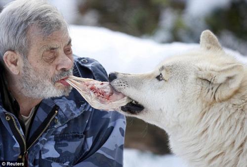 弗洛恩德有时会在雪地里与狼一起玩耍,甚至分享同一块生肉,闲暇之时还会与狼来一个“亲吻”。
