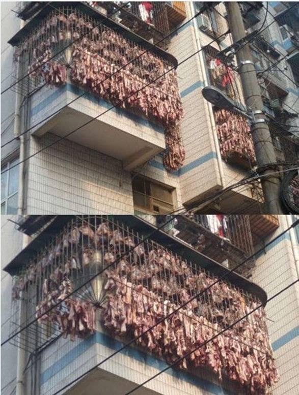 在这户居民家的阳台外防盗网上,密密麻麻晒的全是腊肉,这简直是土豪在炫富,有木有?!
