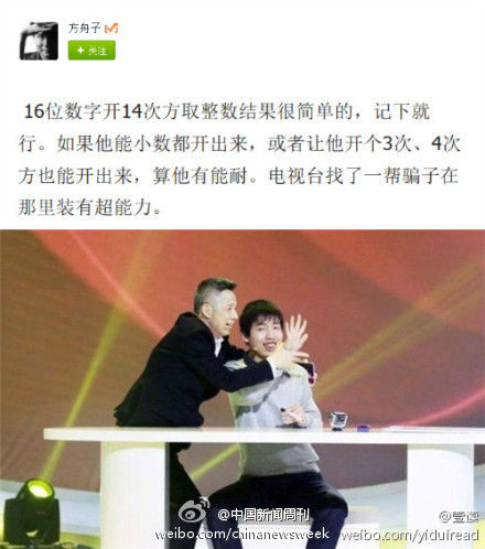 近日,方舟子对中国“雨人”——中度智障青年周玮提出质疑,认为这是电视台找了一帮骗子在那里装有超能力,16位数字开14次方取整数结果很简单的,记下就行。
