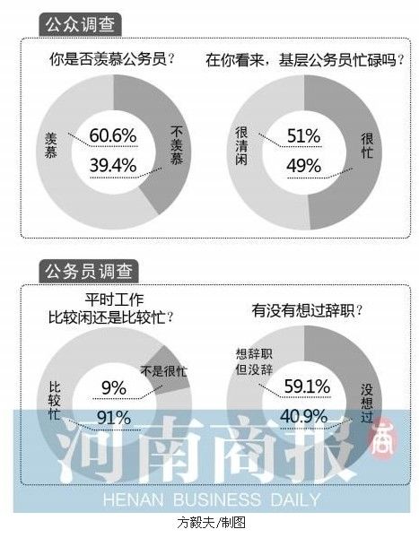 近日,有媒体通过调查收集民众对公务员这个职业的看法,60.6%的受访者羡慕公务员,57.1%的受访者觉得,仅就学历而言,公务员可谓“人中龙凤”,但【受访中六成公务员想过“辞职”,最终却无一人辞职。】