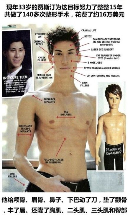 美国男子整容成瘾,十五年来花费十六万美元,整容一百四十多次,终于获得完美外表。