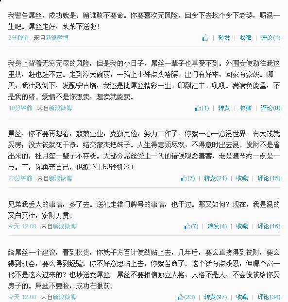 给屌丝一个建议,看到权贵,你就千方百计使劲贴上去,几年后,要么直接得到钱财,要么得到机会,要么得到经验。你不好意思贴上去,你就苦命了。这个话有点残忍,但哪个富一代不是这么过来的?也抄送女屌丝。屌丝不要相信独立人格,人格不是人,不会发钱给你买房子的。屌丝不要脸,成功在眼前。