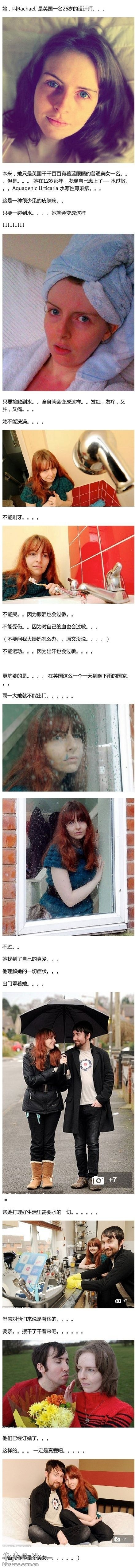 她,是英国的“水过敏女孩”。。。她不能洗澡,不能刷牙,不能淋雨,不能出汗,不能流泪,不能湿吻,不能XXOO。。 总之,一切跟水有关的事情都会让她浑身红肿发痒。。 她有个照顾她一切的未婚夫。 这是真爱吧。。。。。。