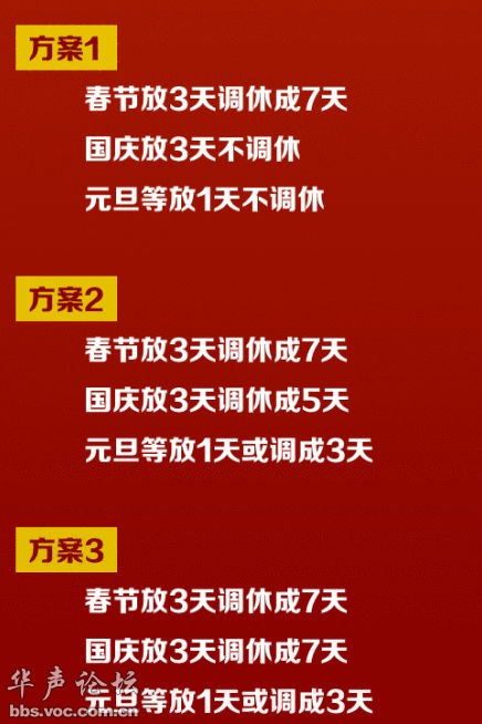 废话,只有方案三保留了两个长假,矮子里面拔将军,多休一天是一天,硬要逼大家选的话,用脚趾头也能预知这个结果。