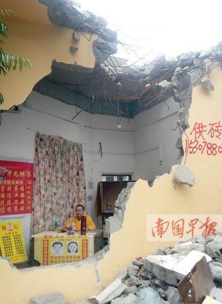 这位南宁算命先生的心理素质绝对杠杠的。在当地一个正在被拆除的屋子里,一名算命先生稳坐泰山似的等待他的客人。