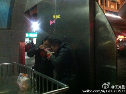 北京零下5度,山区零下10度,风很大、天很冷。在北京西站出站扶梯口,我看到这哥俩正躲在挡风板后吃方便面。(王克勤(微博))
