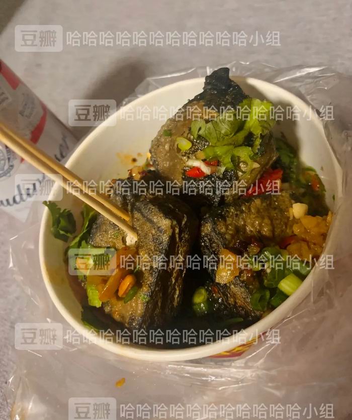 过了五分钟,啤酒小哥回来了,拎着两份臭豆腐:老板说这两份都是八块钱的,都是微辣!!!
