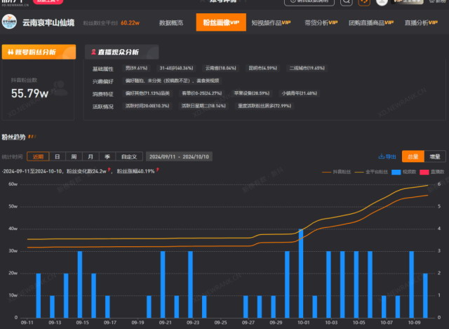 国庆期间,抖音博主 “大壮快跑” 在哀牢山进行了 12 场直播,单场直播最高观看人次达到了 227.59 万,他也通过直播涨粉 3.8 万,目前抖音粉丝量达 34 万。