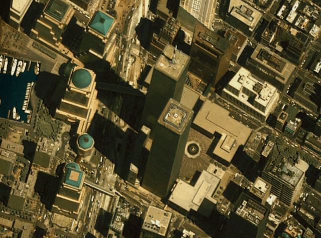 再比如卫星在拍摄地面图像的时候其实并不是完全垂直向下拍摄的,而是会带有一定的角度。对于比较高的建筑来说,?建筑后头有啥,光是靠卫星是永远看不见的。