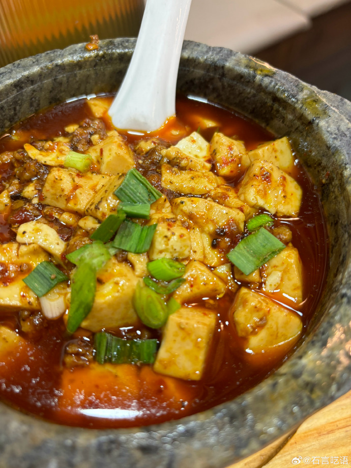 打卡的人非常多,本地外地都有,大部分是慕名而来。招牌菜水煮鱼,新鲜嫩滑,微麻辣,可惜我不喜欢吃鱼刺多的草鱼。麻婆豆腐用滚烫的石锅盛放,这是非常成都的做法,防止豆腐快速变冷,但没有用成都人一贯喜欢的老豆腐。我个人喜欢他的番茄圆子汤口味,番茄已经炖融了,肉丸子的新鲜嚼劲也在,缺点是品相不太好,拍出来始终乱糟糟,莴笋叶也影响了出品形象。