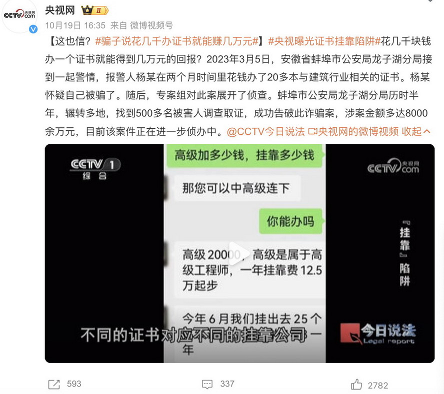@我不是谦哥儿:#央视曝光证书挂靠陷阱# 零几年的时候,一建二建的挂靠一年能拿几万到十几万。当时还没有建筑终身责任制,挂靠费又高,有不少人一边上着班一边考证吃挂靠费。