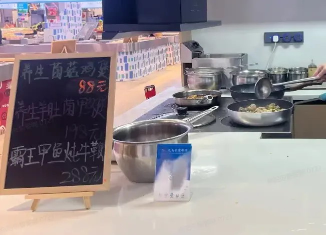 还有一些大菜,比如剁椒鱼头等,加工费在 20 元左右,也可以不买食材单点,就以下面这个档口为例,提供做好的成品菜,养生菌菇鸡煲 88 元、霸王甲鱼炖牛鞭 288 元。