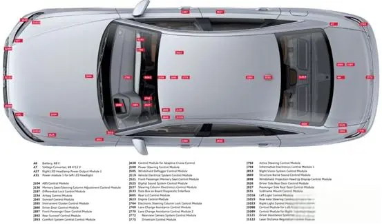 传统上来说,现代汽车最核心的电子元件就是 ECU「发动机控制单元」,一辆传统汽车上,一般有约 80 个 ECU,例如奥迪 A8,线束长度超过 6 公里,几乎是基于分布式系统的复杂性巅峰,将子系统堆到了极限。