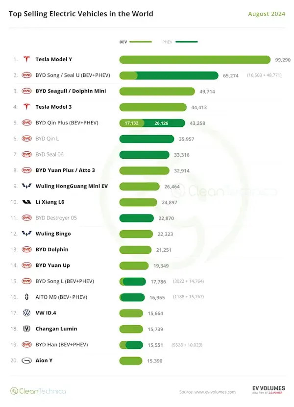 而根据知名汽车研究机构 Clean Technica 发布 2024 年 8 月全球新能源汽车销量情况,包括奥迪在内的欧洲品牌在 TOP20 中全部缺位;畅销车型中,仅大众 ID.4 一根独苗位列第 17 名出现在 TOP20 榜单里。