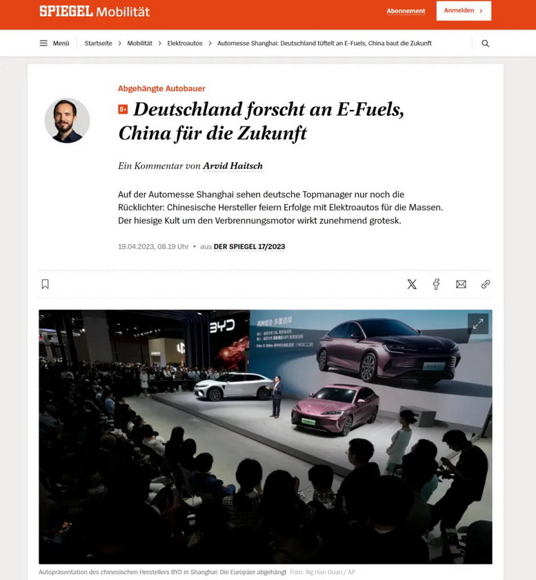 德媒刊文《德国正研究电子燃料,中国在研究未来》,称:“在 2023 上海国际车展,德国高管只看到了尾灯”。