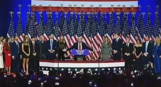 在特朗普的胜利晚宴上,特朗普家族位居中央,然后是他的政治盟友,而曾经风光无限的伊万卡,和犹太丈夫一起站在了边缘,比万斯夫妇站的还远。