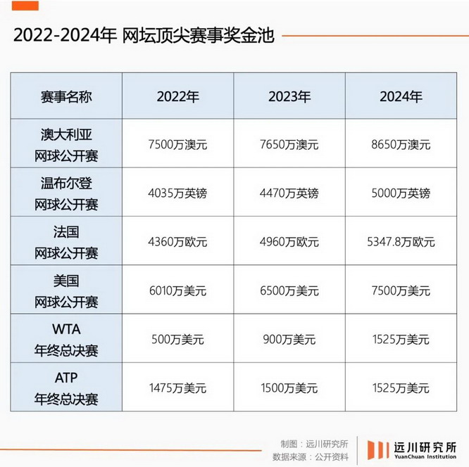 如果看看网坛复杂的管理组织,会发现一个更加系统性的问题 —— 网坛中有 WTA、ATP、ITF 等众多组织和赛事主办方,它们各自为政,在维护组织运营上花掉了大头,因此相对能投入奖金池的部分就少了很多。