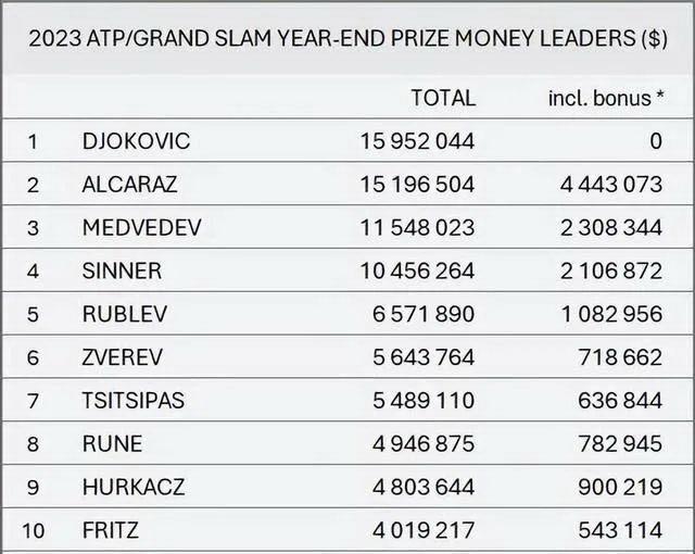 以 2023 年的 ATP 为例,年终分红高达 2130 万美元,但在这一年拿到三个大满贯和年终总决赛冠军的德约科维奇因为积分不够,没有参与分红的资格。而排名第二的阿尔卡拉斯则拿到了 444 万美元的分红,在总奖金上距离小德仅一步之遥。