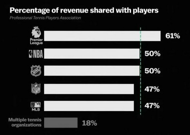 在美国网球公开赛上,球员的奖金池约占赛事总收入的?14%-18%;相比之下,NBA 总收入中的近?50%?会发给球员,美国国家橄榄球联盟、美国国家冰球联盟和美国职业棒球大联盟也都在?45%?以上。