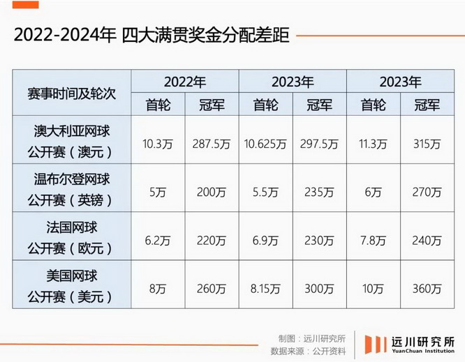 四大满贯奖金分配差距惊人