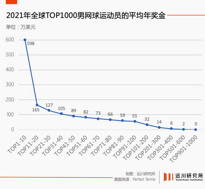 网球媒体 Perfect Tennis 梳理了 2021 年全球 TOP1000 男性网球运动员的平均年奖金。TOP10 的球员年奖金平均到 600 万美元左右, TOP31-40 的球员能通过比赛挣 100 万美元以上,这个数字在 TOP91-100 折半到 54.5 万美元,在 TOP201-300 直接跌到 13.9 万美元。