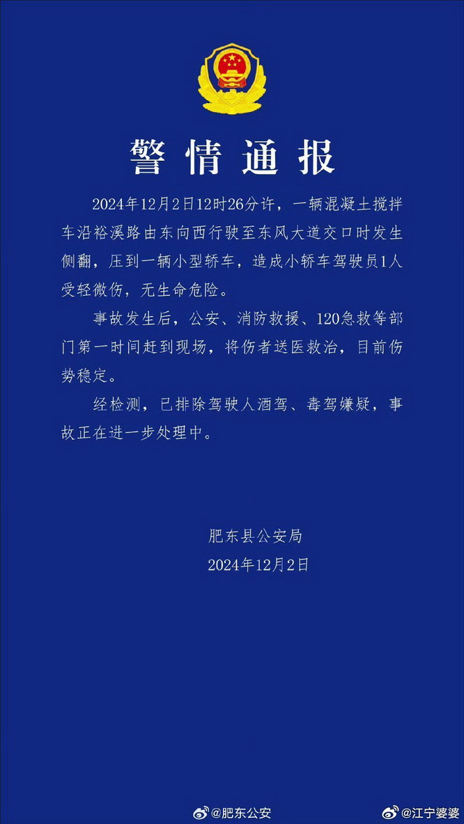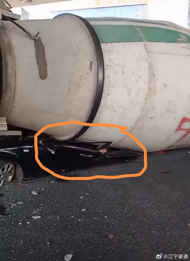 图一:今天中午(2024年12月2日),合肥发生的一起事故,一辆混凝土搅拌车把一辆小车几乎压扁了,被压在下面的小车驾驶员挥手求救