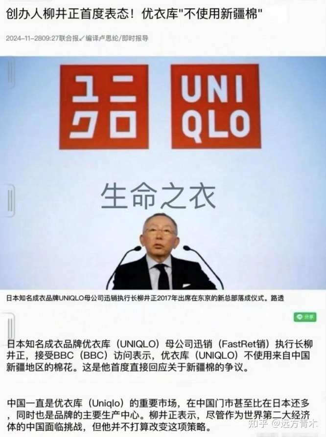 台湾媒体的标题是参考BBC的,但在内容里加了几句话,说虽然优衣库在中国的门店比在日本的还要多,同时也是主要生产中心,但优衣库老板亲自表示不打算改变这项策略(不使用来自中国新疆地区的棉花)。