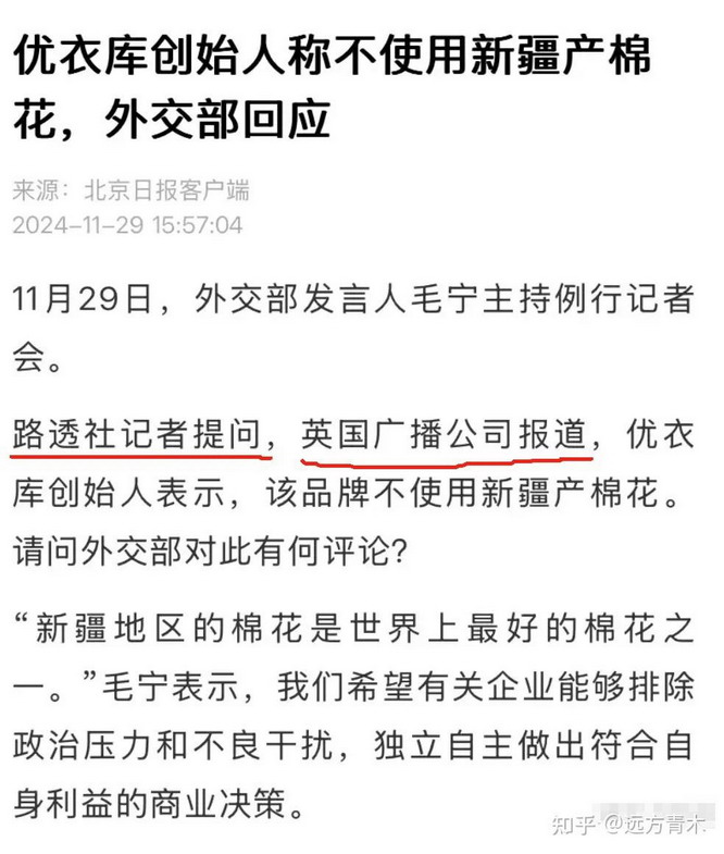 在看到BBC的新闻标题成功在全球掀起舆论后,英国的路透社立马跑到中国外交部这里提问,说根据英国广播公司报道,优衣库创世人表示该品牌不使用新疆产棉花,请问外交部对此有何评论?