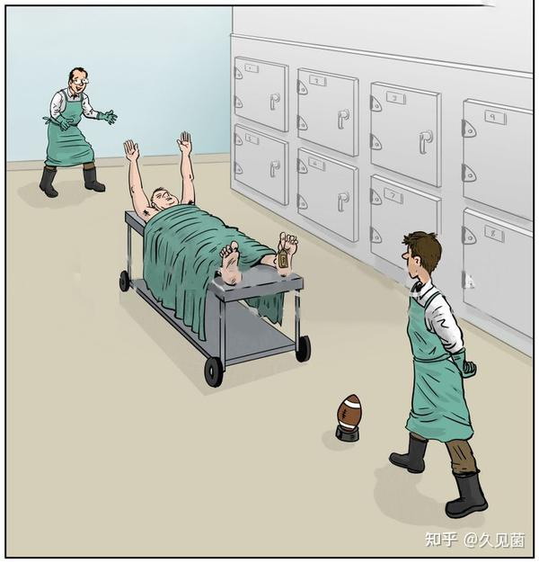 人死后几个小时,尸体就开始了腐烂,如果仔细观察,会发现尸体外部皮肤上有一些蓝绿色的印记,如果是炎热的季节,苍蝇就会围在旁边,这其实就是一个腐烂的标志。相当于面包外部产生的霉点。