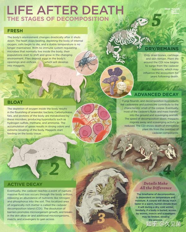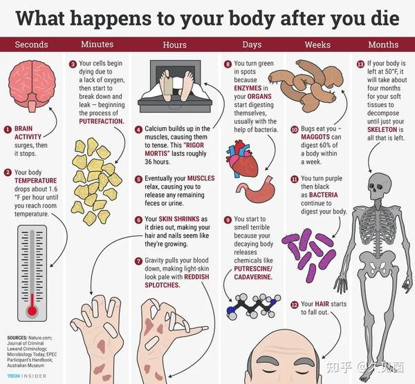 总而言之,尸体的内脏是细菌繁殖的天堂。人类和动物的尸体相比腐烂更快的原因就是人类的内脏不会被及时处理,导致这些细菌的肆意生长,慢慢占据整个身体,散发出难闻的气味。而那些被送进菜市场的动物,在活体时就会被杀,被处理干净,外加冷冻运输,延缓了腐烂的时间。