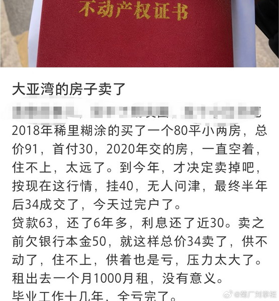 @菊厂刘掌柜:深圳不止一位排朋友买了惠州大亚湾的房子,大部分人没有卖掉,也不住,也不租,而是硬挺着。下面这位卖掉的,没有乱编,是真的情况。