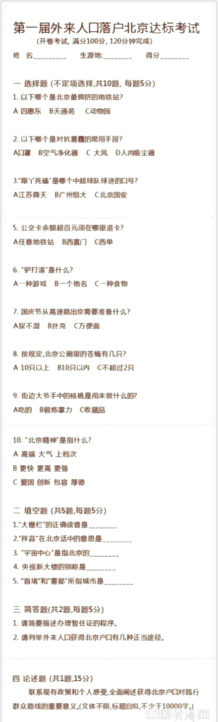 网友抢做恶搞版“北京落户试题”