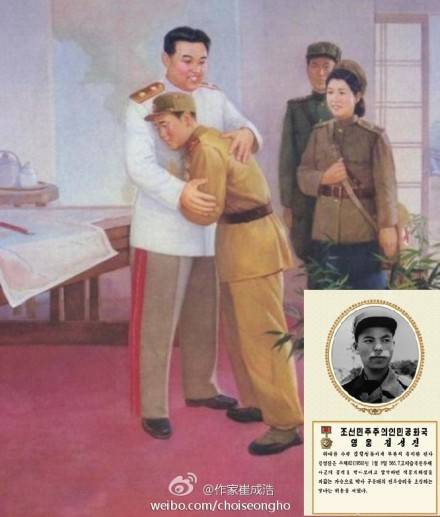 1953年的一场战斗中,美帝碉堡的机枪眼不断吐着火舌。战士金成真悄悄地爬近,猛地站起来用胸口堵住了枪眼,后背顿时被打穿,血流如注,敌人的机枪又挪到另一个枪眼继续扫射,金成真就再次用胸口把这个枪眼堵住,三番五次,美帝机枪手束手无策,只得乖乖就擒。金成真伤愈后,得到慈父金日成主席的接见。(@作家崔成浩 )