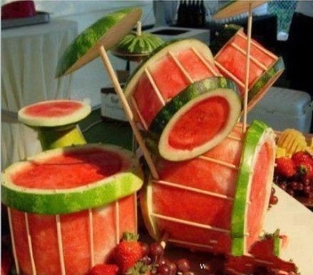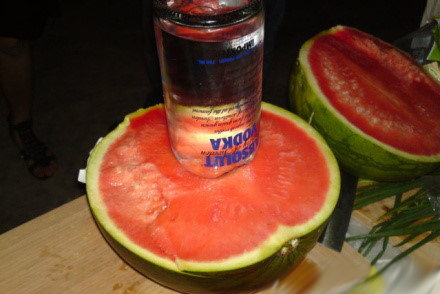 西瓜与伏特加(其他白酒也可)的跨界创意吃法。在西瓜中间挖个洞,将伏特加整支灌入其中。待酒完全渗入西瓜中后,再将果肉挖出来吃。据说非常好吃!