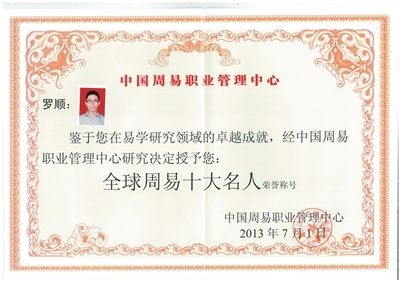 店主获得的“易经大师”证书。来自“中国易经风水官网”