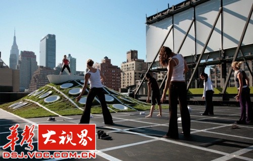 早上纽约渐渐露出晨曦,这个屋顶还有很多人在做瑜伽和普拉提,真是个足够时尚的场所。 屋顶的小坡上面有些小盆夜晚是灯光,白天是座位。