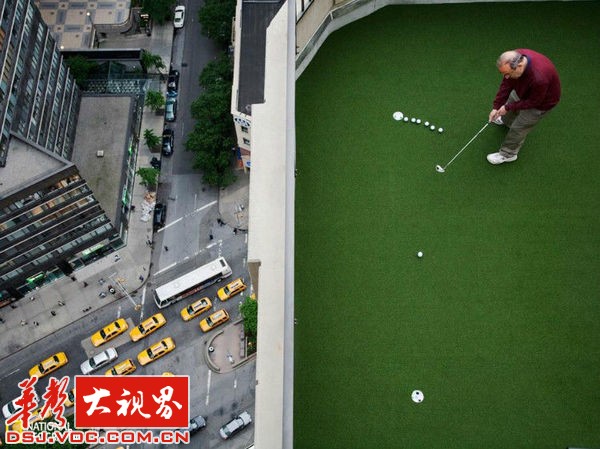 纽约市民查理·波恩哈特在位于百老汇街63号的自家公寓34层楼楼顶的轻击区击球,这片轻击区面积为18英尺X32英尺(5米X9米),是曼哈顿仅有的几个可打高尔夫球的楼顶之一。