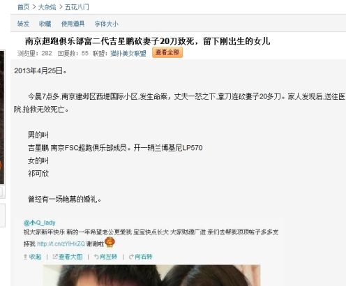 新浪娱乐讯 4月25日,南京建邺西堤国际一居民家中,80后的丈夫怒砍90后的妻子30余刀致死,最可怜的是留下刚出生100天的小宝宝。之后,有网友挖出疑似死者@小Q_lady 前不久还晒出了和丈夫的合照,而他的丈夫吉星鹏被曝是南京FSC超跑俱乐部成员,家境殷实,有数套豪宅,爱好打游戏月花费曾达十万,嗜酒后有家暴行为。