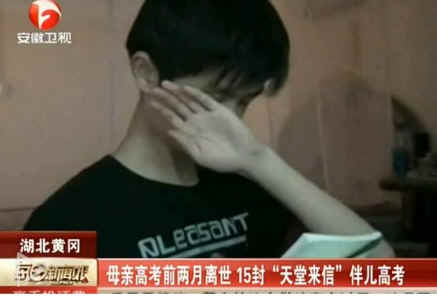 近日,人民日报转载了一篇报道《母亲患癌去世 15封天堂来信伴儿高考》,说的是一位湖北黄冈籍考生刘一芃在结束最后一门功课考试后得知,他的母亲早在两个月前就因病去世了。而在此之前,他每个礼拜都能收到一封母亲对他鼓励的亲笔信。原来,母亲在得知自己不久于人世后,坚持抱病给准备参加高考的儿子写了15封亲笔信,目的是不想因为自己的病情影响儿子的考试。这15封饱含亲情和鼓励的信,在她去世后,由父亲每隔一个礼拜交给儿子一封。