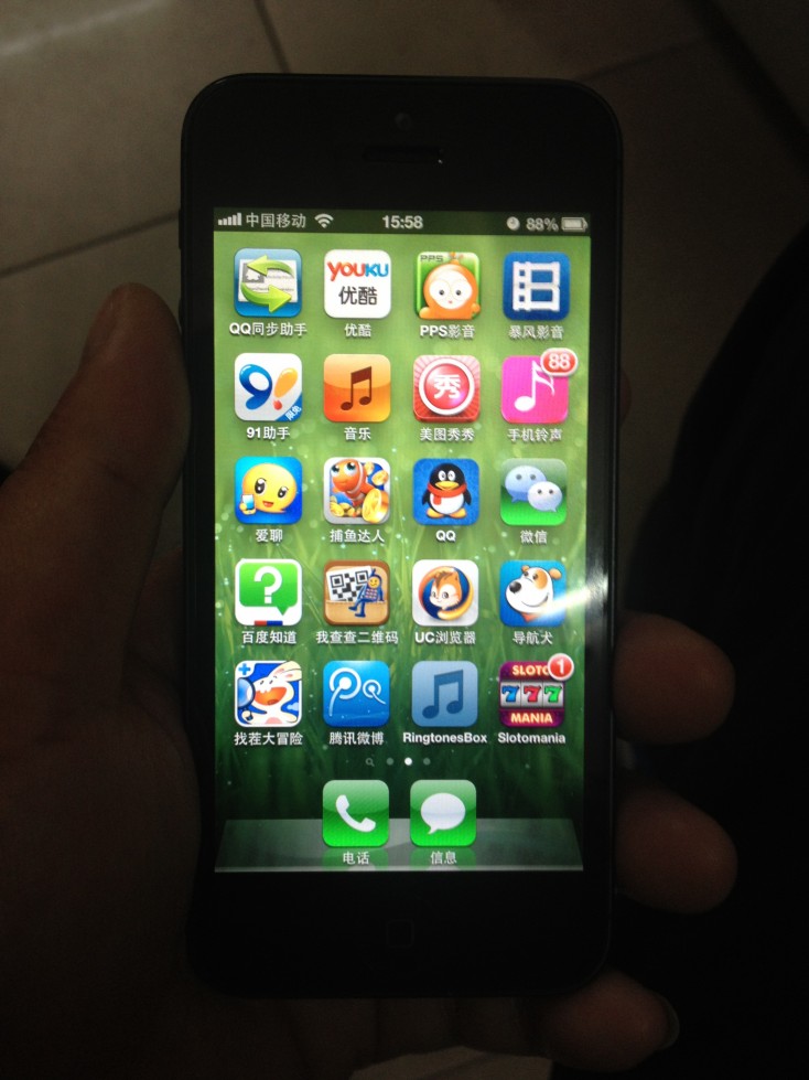 说实在,I5实物在手后,觉得完全失望,与I4S只是相差了一点点,比4S薄一点,重量轻一点,宽度没变,长度大概长了一支铅笔横放的高度,其他没啥亮点,没试视频和摄像头,但是目前要7000多人民币,还是持有4S算了,毕竟1顶2哦·
