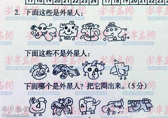 原帖由 Guest from 150.36.155.x 于 2013-2-4 13:25 发表 外星人身体上有且只有三个圆珠子,脸上有且只有一个三角形, 选4. 找规律嘛,用不着那么危言耸听.和"外星人"有毛关系