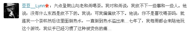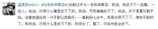 衣锦夜行的燕公子:六点登鼓山与一老和尚喝茶。我对和尚说:我放不下一些事,放不下一些人。他说:没有什么东西是放不下的。我说:我花了很久的时间,可就偏偏放不下。老和尚凝视我良久缓缓滴说说:以我多年经验,施主啊,放不下通常是因为你硬盘容量不够。