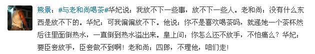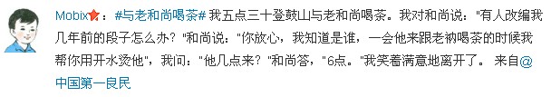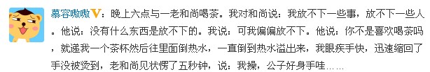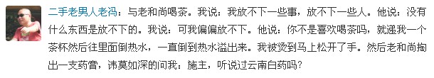 今天一个佛偈“放下”的小故事成为了网友微博恶搞的对象,大家似乎很享受把人生哲理故事该写恶搞的过程。话题起于薛蛮子早上发的一条”和尚喝茶“的微博。@薛蛮子:六点登鼓山与一老和尚喝茶。我对和尚说:我放不下一些事,放不下一些人。他说:没有什么东西是放不下的。我说:可我偏偏放不下。他说:你不是喜欢喝茶吗,就递我一个茶杯然后往里面倒热水,一直倒到热水溢出来。我被烫到马上松开了手。和尚说:这个世界上没有什么事是放不下的。痛了,你自然就会放下。