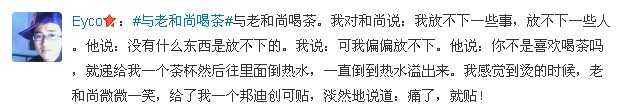 @给你王子倒不如王子面: 登鼓山与老和尚喝茶。我说:我放不下一些事,放不下一些人。他说:没有什么东西是放不下的。我说:可我偏偏放不下。他说:你不是喜欢喝茶吗,就递我一个茶杯然后往里面倒热水,一直倒到热水溢出来。我烫到松开了手。和尚说:捏着把儿啊!你抓着杯身干嘛,傻逼!