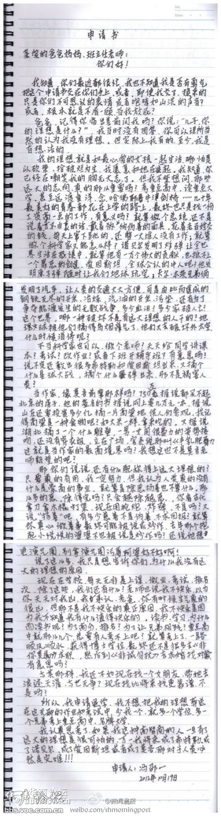 “我申请退学,不想把理想葬送在无聊的考试中。”10岁男孩冯邵一的《申请书》引发热议。“我的理想是和心爱的女孩一起生活,哪怕以砍柴、捡破烂为生。”他成绩优异连跳三级,现读初一,希望“更舒服、更自由地读书”。