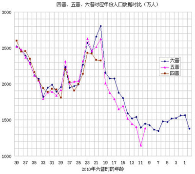 2000年第五次人口普查数据显示5~49岁人口为93398万,2010年第六次人口普查数据显示15~59岁人口为93962万,10年过去了,六普数据对比五普数据显示1951~1995年出生的人不仅一个不死,还多了564万。